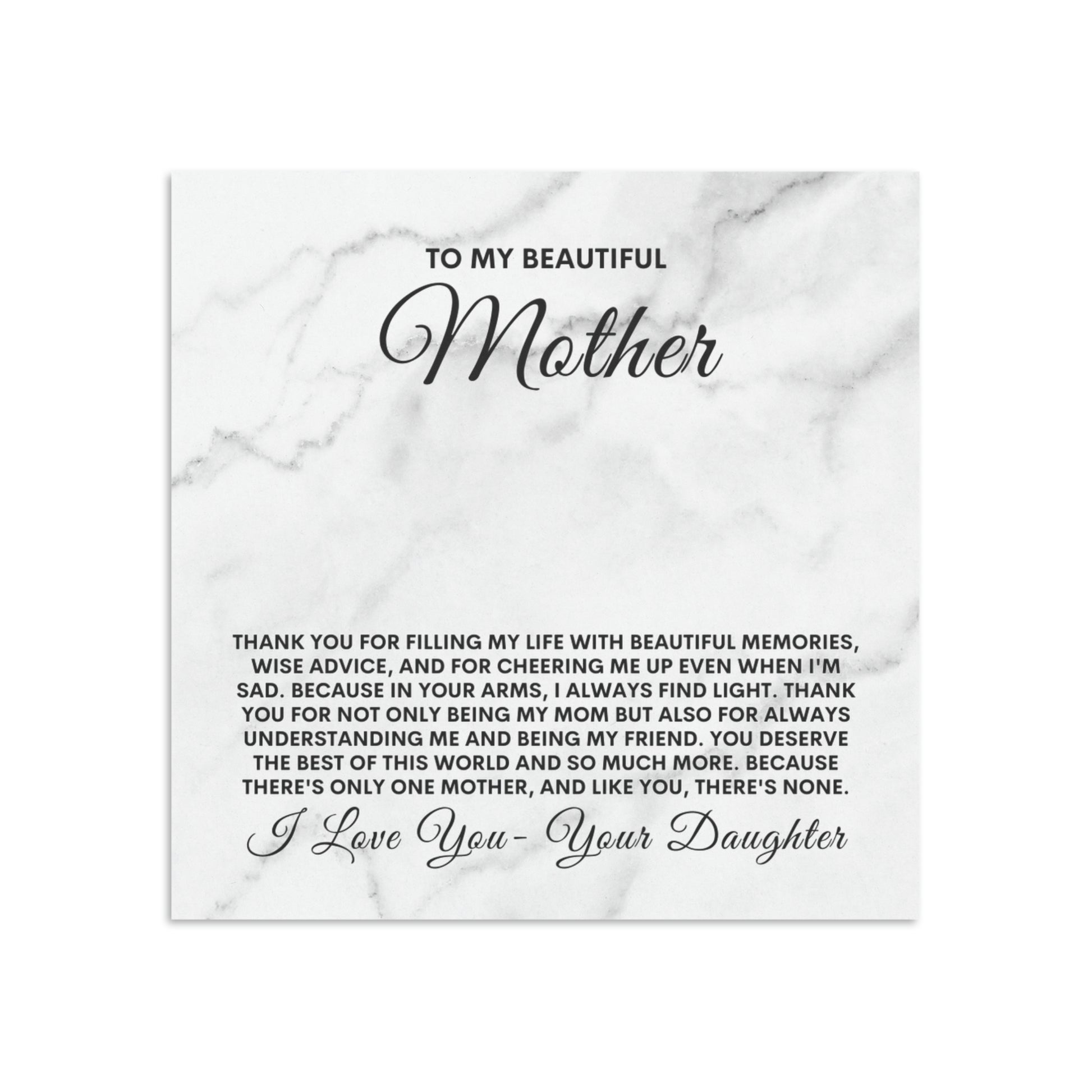 “To my beautiful mother. Thank you for filling my life with beautiful memories, wise advice, and for cheering me up even when I'm sad. Because in your arms, I always find light. Thank you for not only being my MOM but also for always understanding me and being my FRIEND. You deserve the best of this world and so much more. Because there's only one mother, and like you, there's none. Love your daughter.”